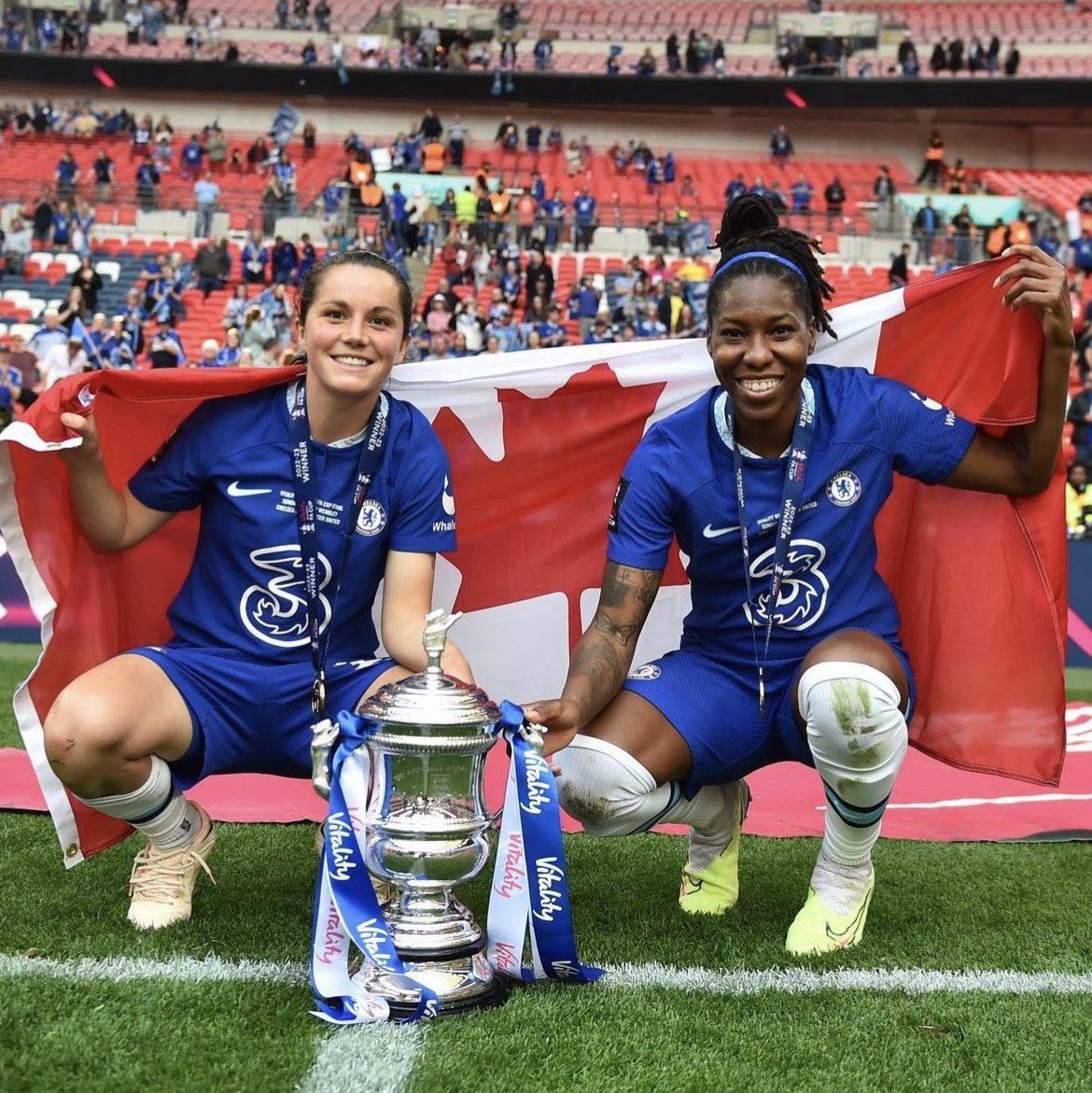 In a crucial game in the WSL title race, Chelsea won 6-0 against Leicester City. Jessie Fleming played the last twenty-five minutes in that match. In a sight for sore eyes, Kadeisha Buchanan played the last fifteen—her first time on the pitch in five and a half weeks. Arsenal also won their mid-week match 4-0 against Brighton, keeping them in the hunt for UWCL. Sabrina D’Angelo was on the bench for that match. On Sunday, Chelsea and Manchester United traveled to Wembley for the FA Cup final. Jayde Riviere did not feature for United, but Fleming earned the start and Buchanan came on for the final few minutes. It was a tight match, and the final score was 1-0 in favour of Chelsea.